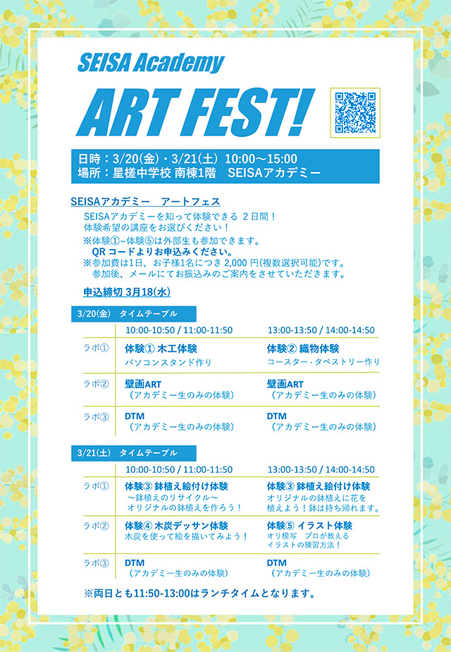 SEISAアカデミーへの出願条件として土曜体験講座と学校説明会への参加は必須となります。 まずは体験授業や説明会へ参加して、SEISAアカデミーを体験してみよう!たくさんのご参加をお待ちしています。
