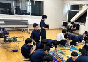 学校内では、毎年恒例のプラレール走行会を行い、部員たちがレールを組み立てて、